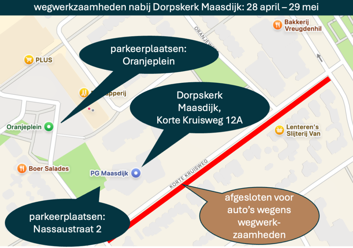 ![]() Van 28 april tot 29 mei vinden er rond ons kerkgebouw wegwerkzaamheden plaats. De hoofdingang aan de Korte Kruisweg is in deze periode niet met de auto te bereiken. Komt u met de auto naar de kerk, navigeer dan naar Nassaustraat 2 en parkeer op de straat of op de parkeerplaatsen bij het winkelcentrum aan het Oranjeplein. We verwelkomen u graag in onze kerk. | ||